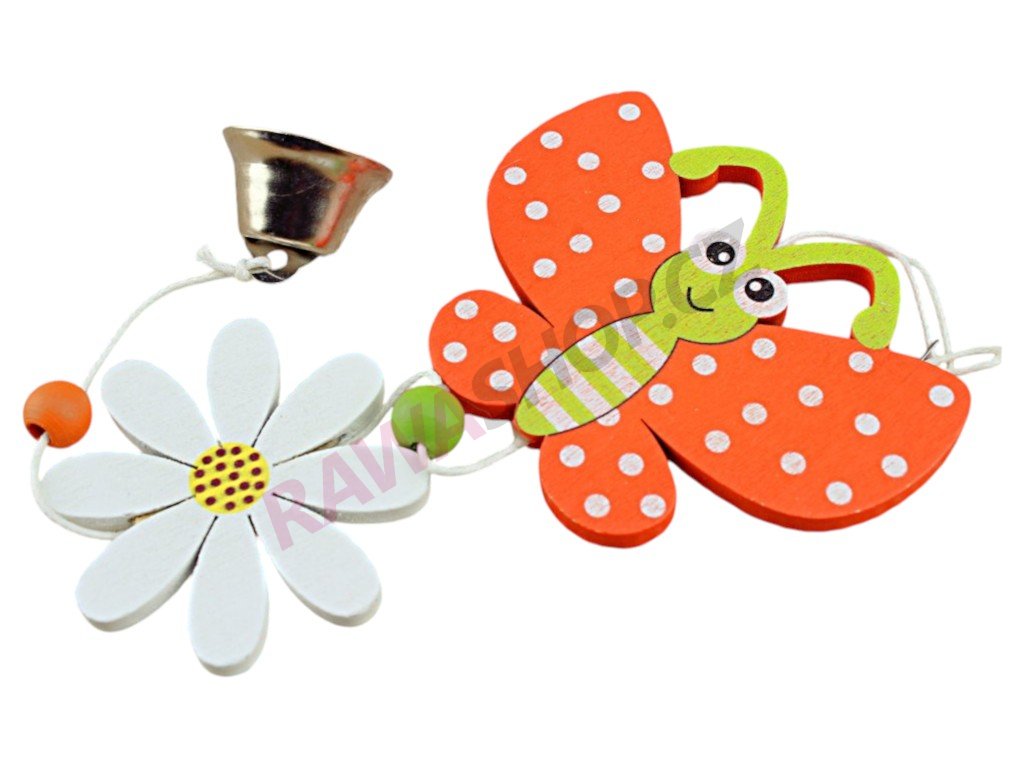 Dřevěná závěsná dekorace motýl se zvonkem a květinou. Je vhodná jako samostatná dekorace, ale i jako polotovar pro další dekorativní výrobu.