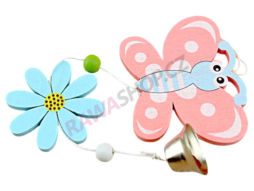 Dřevěná závěsná dekorace motýl se zvonkem a květinou. Je vhodná jako samostatná dekorace, ale i jako polotovar pro další dekorativní výrobu.
