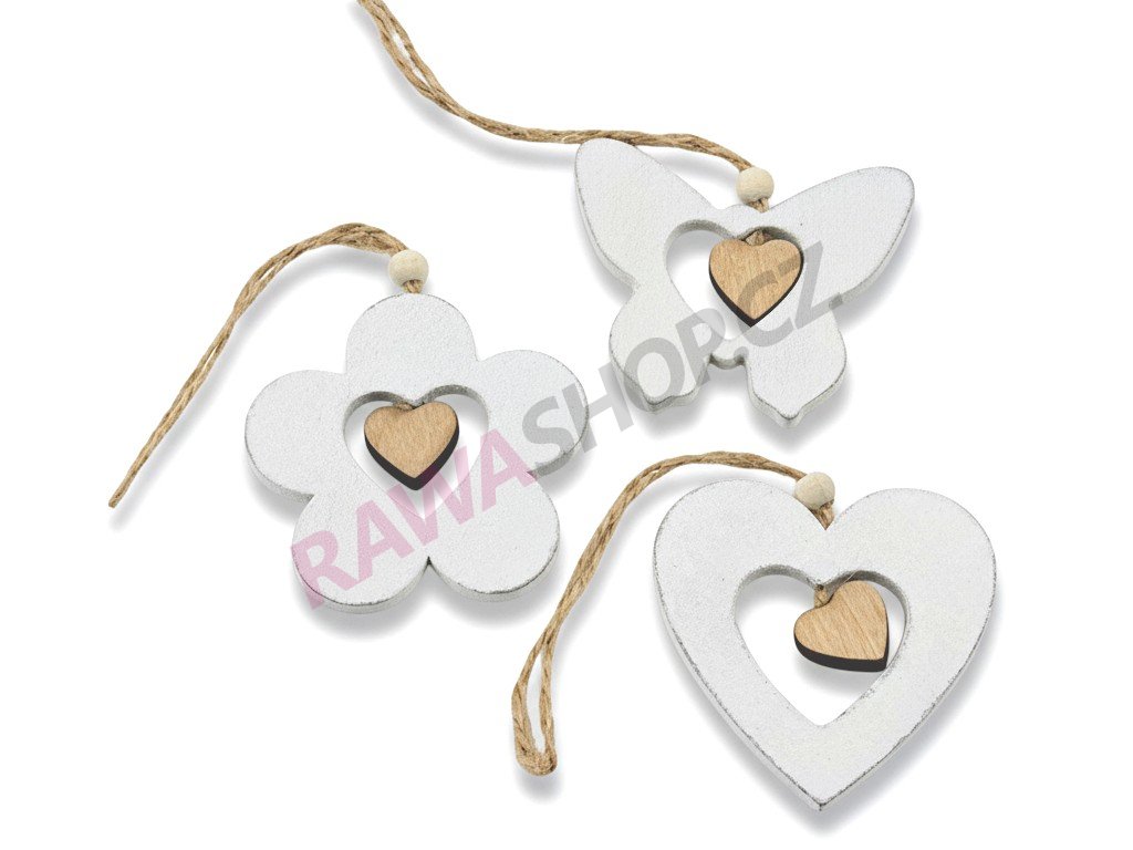 Dřevěná závěsná dekorace. Balení obsahuje 1ks motýla, květinu a srdce.