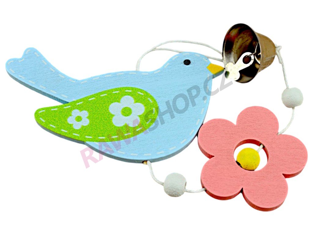 Dřevěná závěsná dekorace ptáček se zvonkem a květinou. Je vhodná jako samostatná dekorace, ale i jako polotovar pro další dekorativní výrobu.