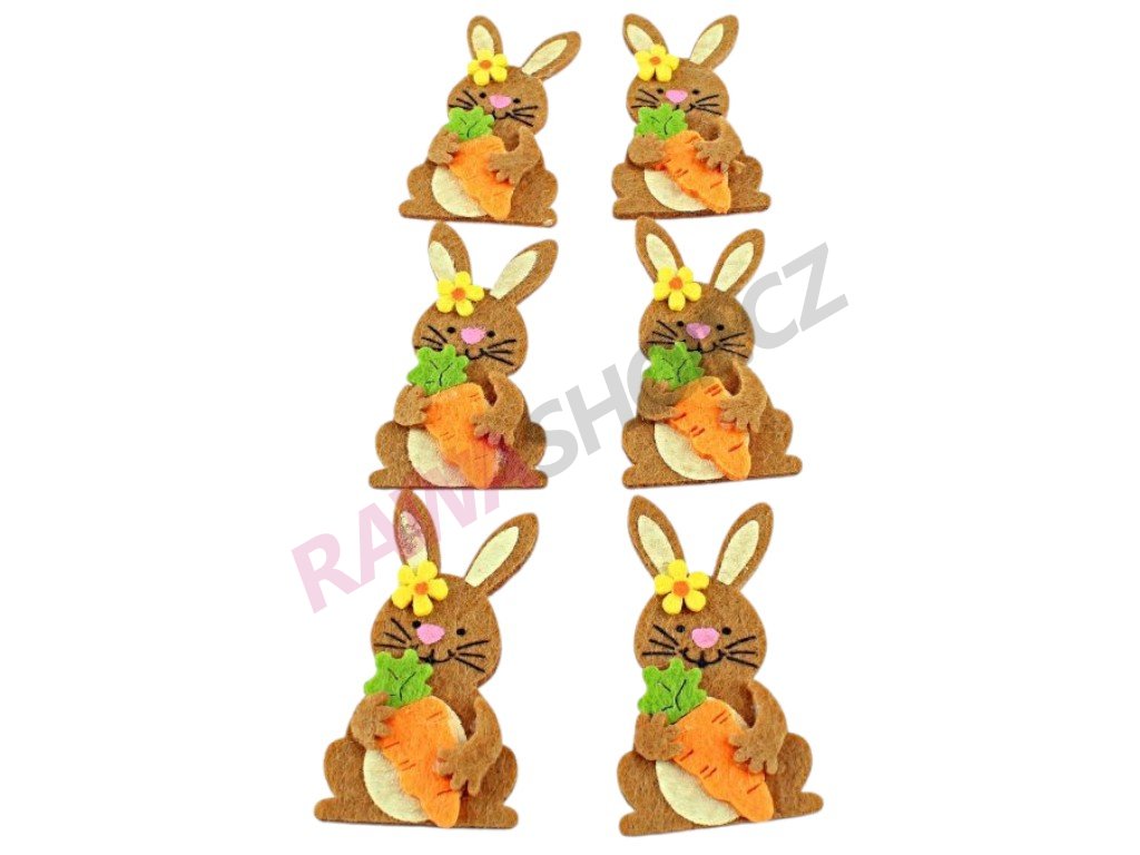 Dekorativní ozdoba zajíc je vyrobena z barevného filcu. Na zadní straně je malá nálepka pro snadné připevnění na požadované místo.